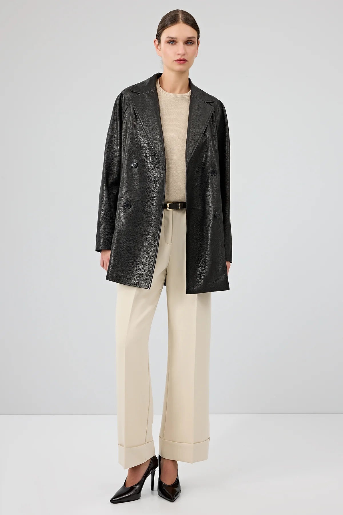 Derimod’un Zarifliği ve Şıklığı bir arada sunan Wendy Kadın Siyah Kruvaze Yaka Uzun Deri Ceket ile tarzınızı konuşturun. Ürünün kodu: 25SGD52912H 4A