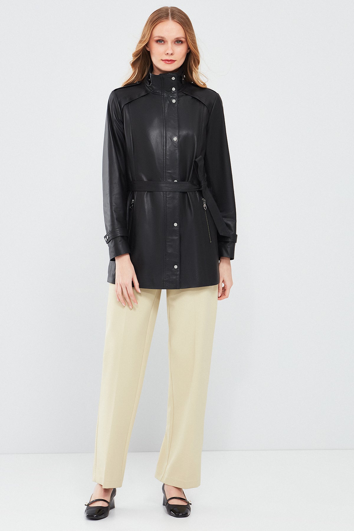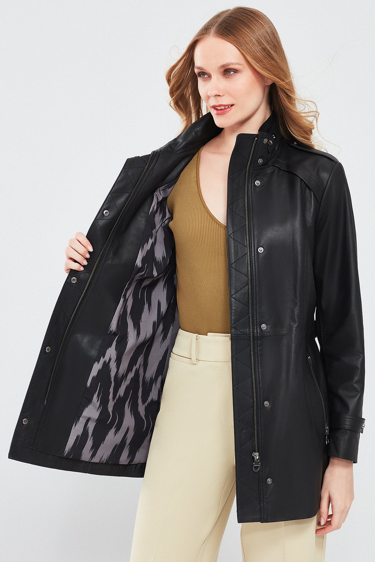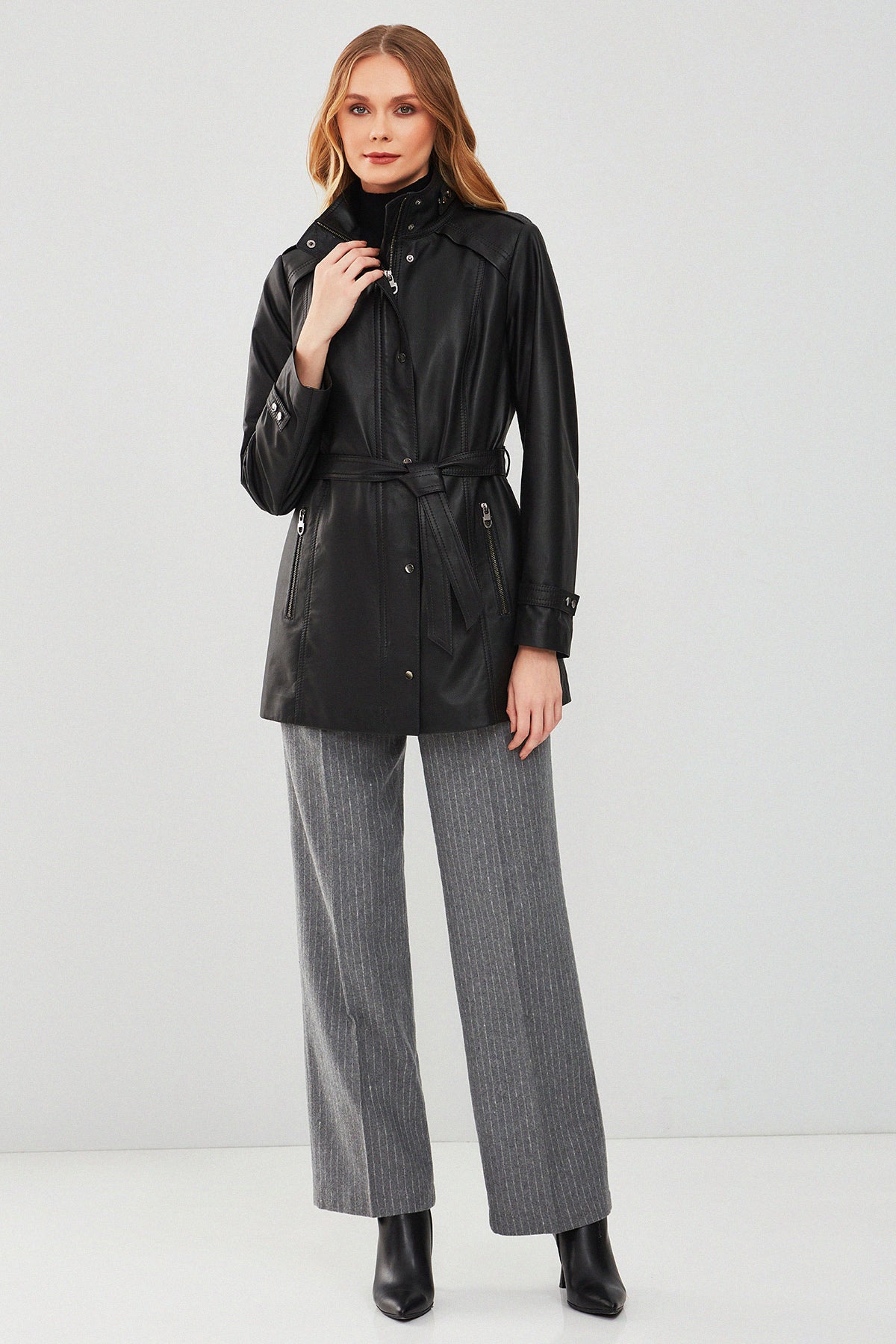 Derimod'un Whitney Kadın Siyah Deri Ceketi, şıklığı ve fonksiyonelliği bir arada sunar. Bu ceket, yüksek kaliteli deri malzemesiyle üretilmiştir. Çıt çıt ve fermuarlı kapama detayıyla öne çıkan bu model, modern ve şık bir görünüm sunar. Siyah rengi, klasik ve zamansız bir şıklık sağlarken, deri malzemesi cekete dayanıklılık ve kalite kazandırır. Hakim yaka detayı ise cekete farklı bir hava katar. Ayrıca belinde bulunan kuşak detayı, cekete ekstra şıklık ve vurgu katmaktadır. Regular/standart kalıbı, her bedene uyum sağlar ve rahat bir kullanım sunar. Whitney Kadın Siyah Deri Ceket, günlük kullanımdan özel günlerdeki kombinlerinize kadar geniş bir kullanım alanı sunar. Derimod kalitesiyle tasarlanan bu ceket, gardırobunuzun vazgeçilmez parçası olabilir.