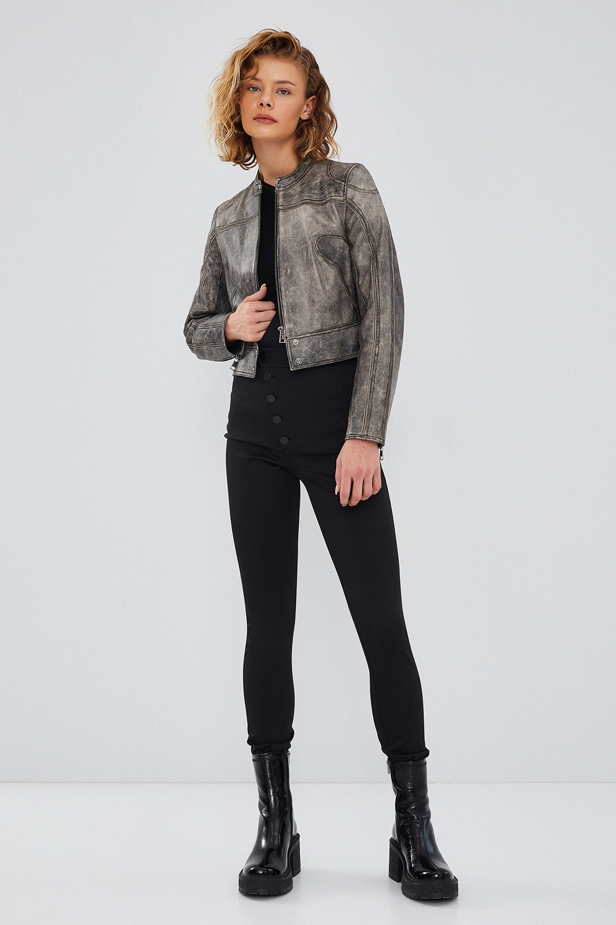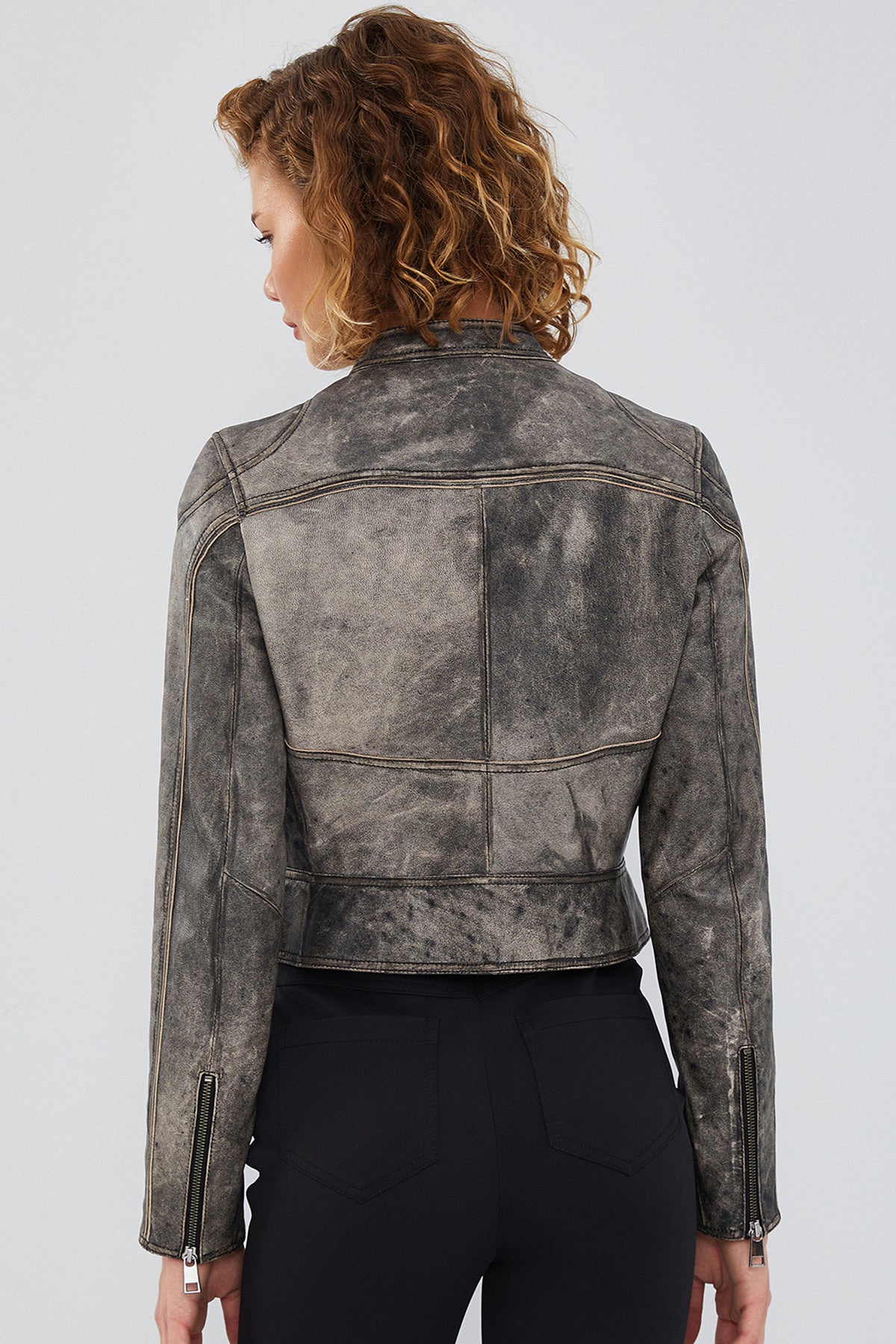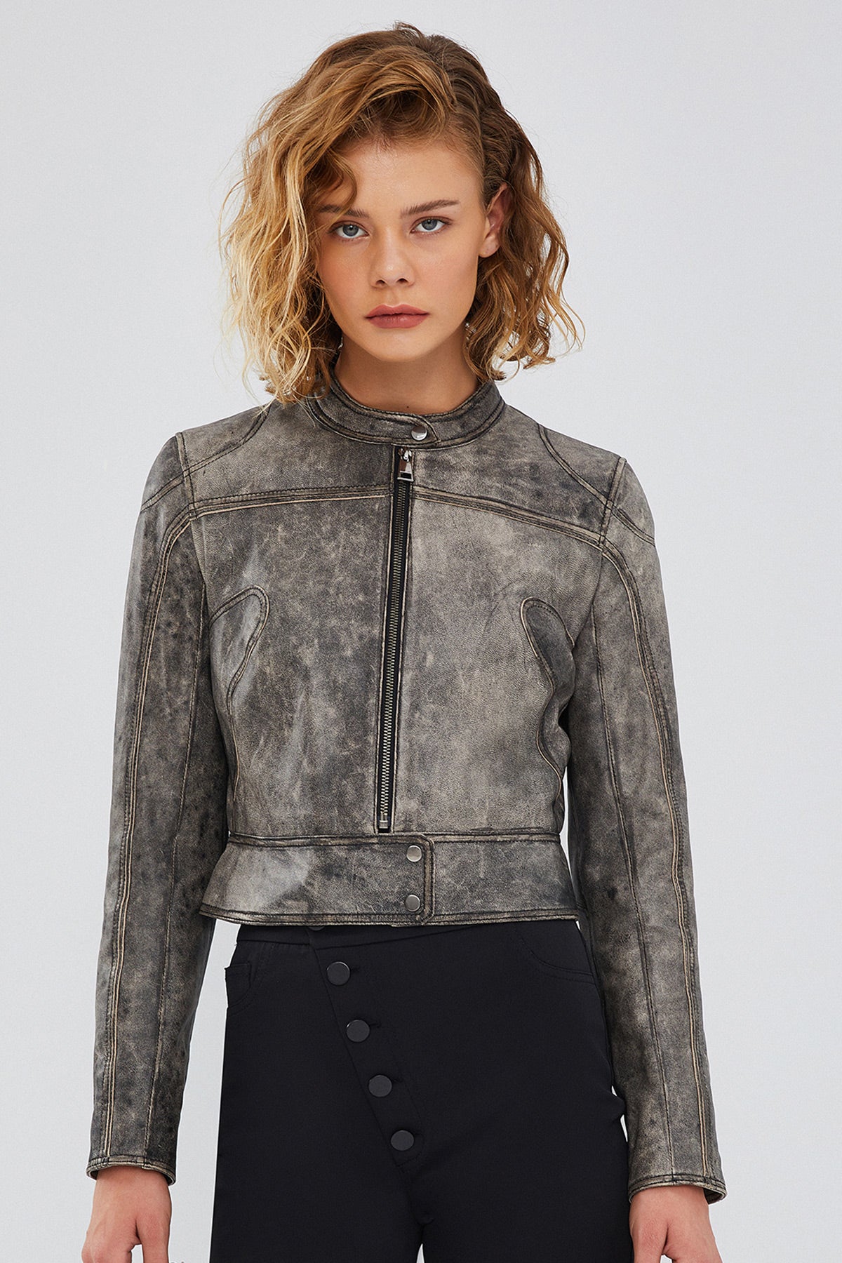Zoey Kadın Gri Vintage Kısa Deri Mont